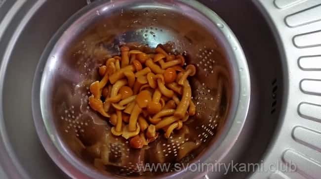 Проціджуємо за допомогою сита гриби промиваємо їх кип’яченою водою. Особливо це стосується маслюків, так як вони дуже слизькі.