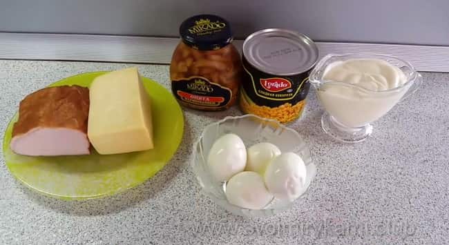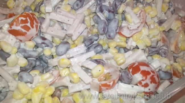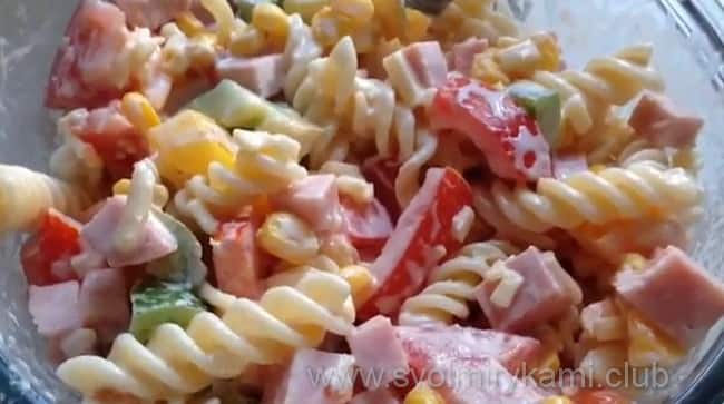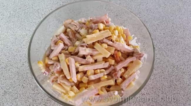 Салат з шинкою, помідорами, сиром і кукурудзою відеорецепт