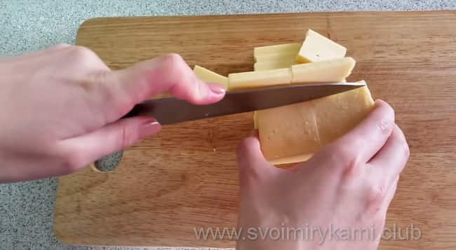 Також тонкою соломкою нарізаємо сир і відправляємо його до решти продуктів.