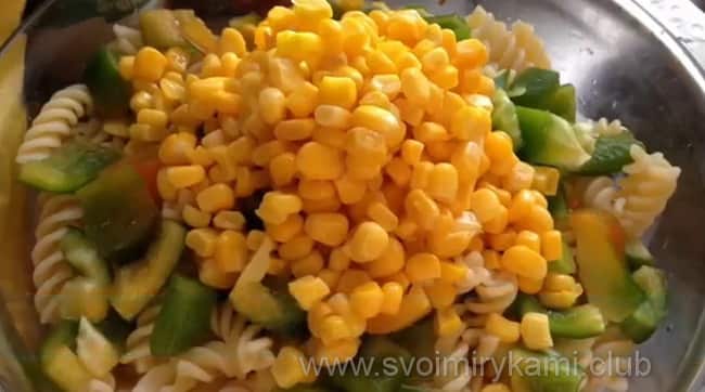 Проціджуємо кукурудзу через сито і кладемо до решти інгредієнтів.