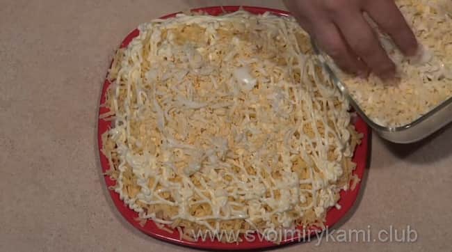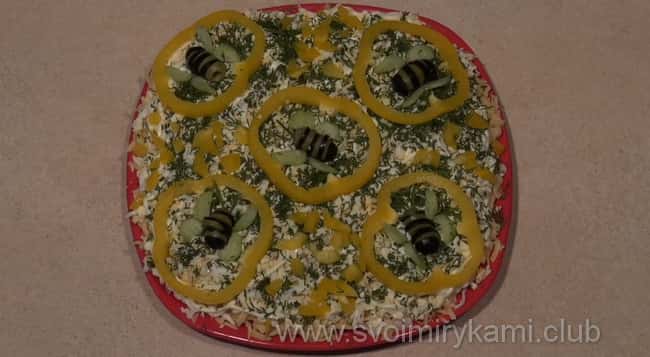 Перець очищаємо від середини з насінням, нарізаємо кубиками й викладаємо наступним шаром, який теж покриваємо майонезом.Охолоджені яйця очищаємо і натираємо великої стороною терки. Робимо завершальний яєчний шар і теж змащуємо майонезом.