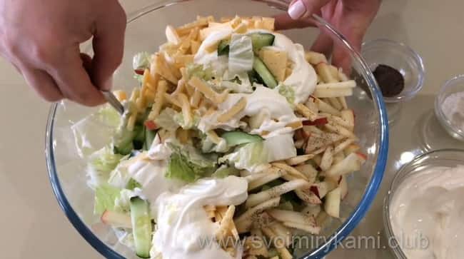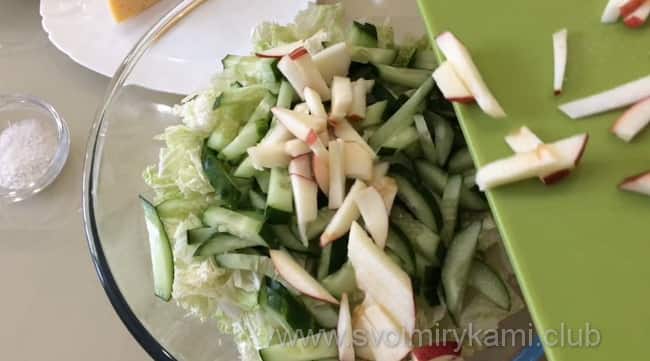 Сир натираємо великої стороною терки. Це краще робити більш довгою стороною сирного шматочки, тоді готовий салат буде виглядати цікавіше.Яблуко моєму, тонко знімаємо шкірку за допомогою ножа для чищення овочів, розрізаємо навпіл і вирізаємо серцевину. Кожну половинку натираємо великою теркою.Вимитий огірок нарізаємо невеликою соломкою, намагаючись це робити трохи навскіс.