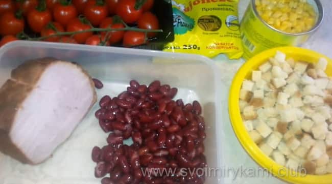 Вся складність в приготуванні цього салату складається приготуванні сухариків. Для цього беремо скибочки хліба або батона і нарізаємо їх однаковими кубиками. Краще брати не дуже свіжий хліб, тоді він не буде кришитися, і його легше нарізати.Обсмажуємо хлібні кубики на сухій сковороді або підсушуємо на деку в духовці до дуже легкою золотавості. Даємо сухарикам повністю охолонути.Нарізаємо шинку на пластинки, а потім соломкою. Кладемо її в глибоку ємність.Проціджуємо через сито кукурудзу і квасолю і перекладаємо їх до шинки. Якщо у вас немає консервованої квасолі, то її можна відварити самостійно протягом 45 хвилин до повної готовності, а потім добре остудити.Помідори нарізаємо шматочками і теж додаємо до шинки.