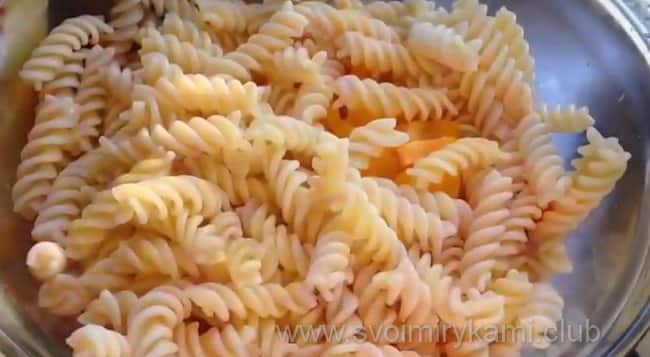 Ллємо в каструлю приблизно один літр води, ставимо її на плиту і доводимо до кипіння.Після цього сиплемо чайну ложку солі, перемішуємо і кидаємо у воду макарони чи локшину, Мені більше подобається в салаті вид спіральок, але також цікаво і смачно виходить із звичайною або рисовою локшиною. Якщо ви використовуєте довгу локшину, то перед тим як відварити, її потрібно буде розламати на кілька частин.Варимо макарони до стану «аль денте» приблизно 5-6 хвилин, для локшини вистачить 4 хвилин, а рисова локшина готується взагалі практично миттєво. Після цього проціджуємо наші макаронні вироби через друшляк, промиваємо холодною, кип’яченою водою і даємо їм повністю охолонути.