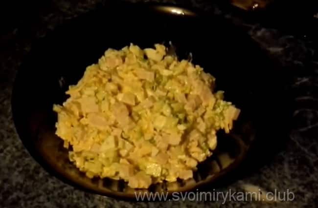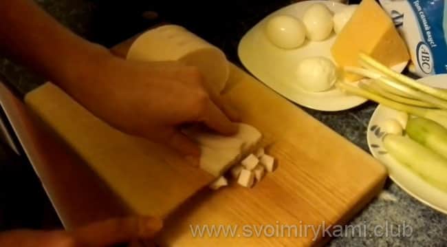 Приготування салату почнемо з того, що заллємо яйця водою і поставимо варитися. Після закипання варимо яйця круто приблизно 10 хвилин, потім зливаємо окріп і заливаємо їх холодною водою.Коли яйця охолонуть, очищаємо і нарізаємо їх кубиками або натираємо на крупній тертці.