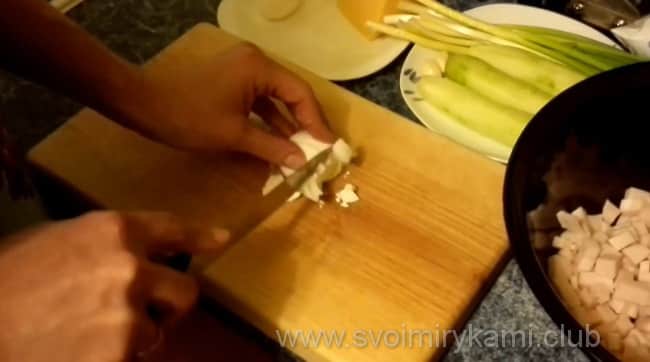 Шинку нарізаємо нетовстий соломкою або кубиками. Шинку можна брати будь-яку. Мені більше подобається куряча, так як вона більш ніжна.