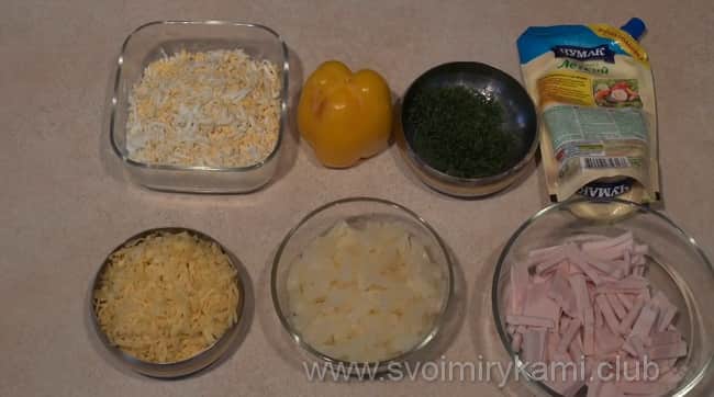 Салат з ананасами, шинкою і болгарським перцем відеорецепт