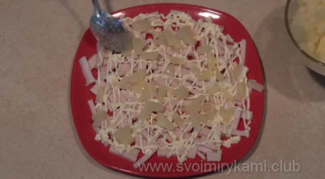 Сир нарізаємо тонкою соломкою або натираємо великою теркою. Викладаємо на ананасовий шар і поливаємо майонезом.