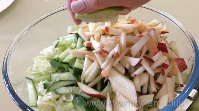 Вичавлюємо з половини невеликого лимона або лайма сік, намагаючись, щоб салат не потрапили кісточки.