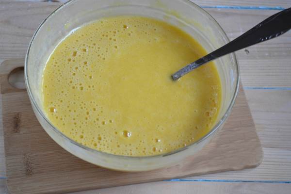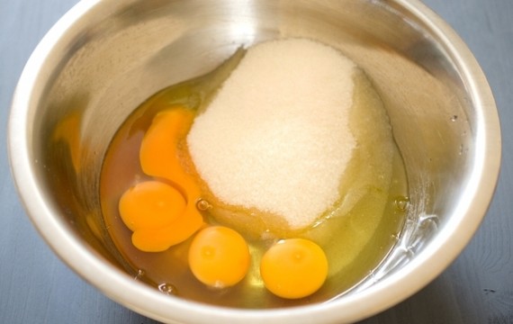 Для початку, дані продукти можна перемішати віночком, або ложкою. Далі, слід задіяти кухонну техніку. За допомогою міксера перебиваємо цукор з яйцями до того стану, що б крупинки цукру повністю розчинилися.