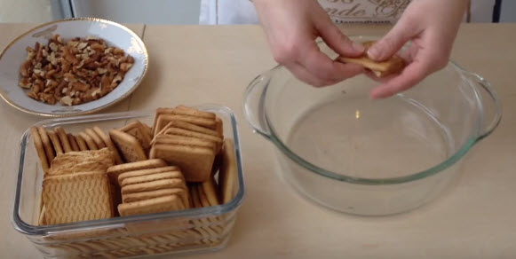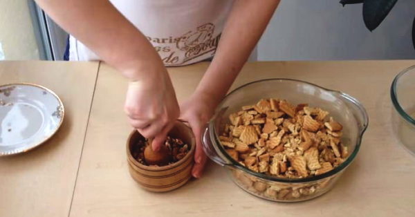 Крупно порубати або розім’яти в ступі горіхи, змішати їх з разломанным «крихту» пісочним печивом.
