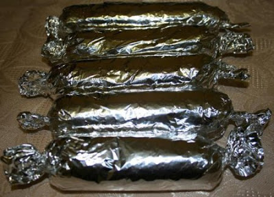 Поділити приготовану масу на приблизно рівні частини, кожну ковбаску обернути харчовою плівкою або фольгою, надаючи їм форму ковбасок.