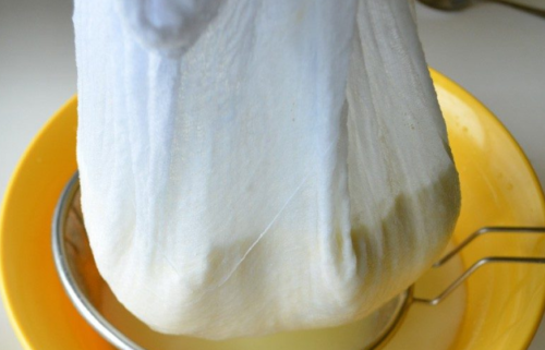 - В друшляк, вистилають тканину у кілька шарів – краю повинні звисати вільно.