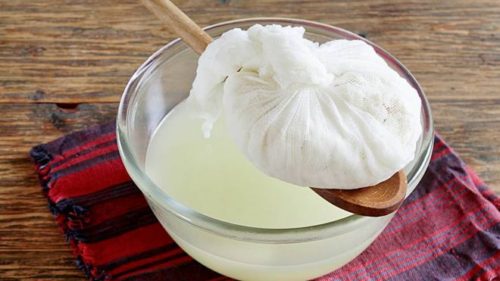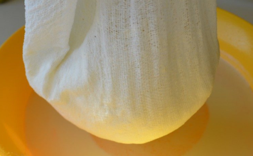 - Краї тканини пов’язують, вузол фіксують над ємністю для стікання і чекають кілька годин, до одержання кінцевого результату.