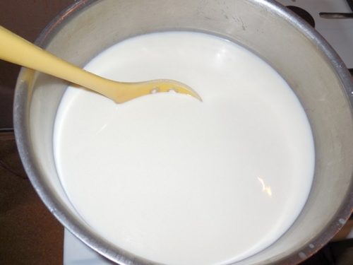 - Кисле молоко вливають у місткість для приготування, розміщують на помірний вогонь.