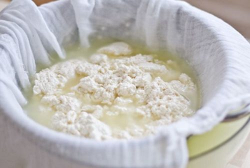 Після того як сформуються великі грудки, весь вміст каструлі вивертають на дрібне сито – чекають поки зійде сироватка.