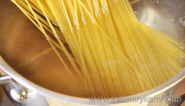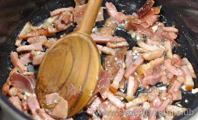 - Також в оригінальному рецепті додають засолену або в’ялену свинячу щоку. Це м’ясо дуже ніжне й ароматне. Оскільки це не дуже поширений продукт, його можна замінити на шинку або бекон, як у нашому випадку.