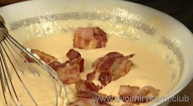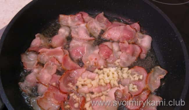 Дрібно наріжте бекон, обсмажте на оливковій олії до хрусткого стану. Потім відкиньте його на друшляк, щоб стік зайвий жир.