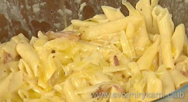 Додайте гарячу пасту в миску з сирно-яєчної сумішшю. Відразу ж додайте смажений бекон. Ретельно перемішайте, щоб соус розплавився і почав огортати пасту. Все готово.