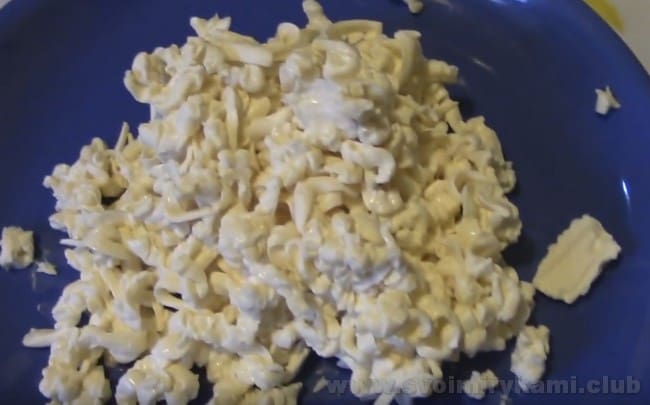 Відварюємо круто три яйця. Охолоджуємо їх у холодній воді. Потім яйця очищаємо і нарізаємо невеликими кубиками.