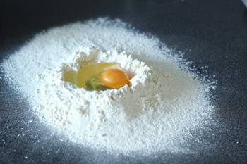 Спочатку приготування вам необхідно просіяти гіркою борошно в миску або на обробну дошку. У зроблене в гірці борошна поглиблення розбити яйце, посипати його сіллю і розбовтати виделкою.