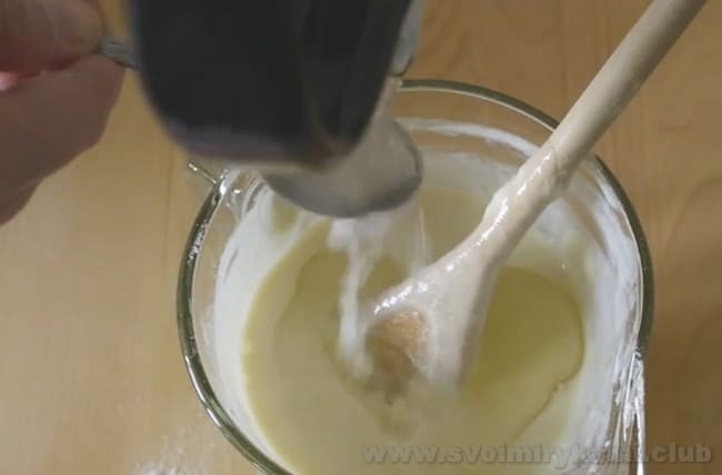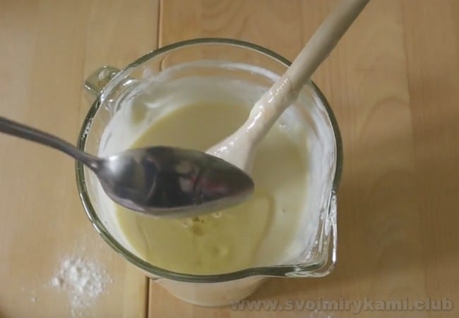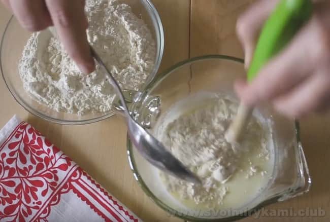 • По одній ложці додайте просіяне борошно і розмішуйте, щоб не було грудок.