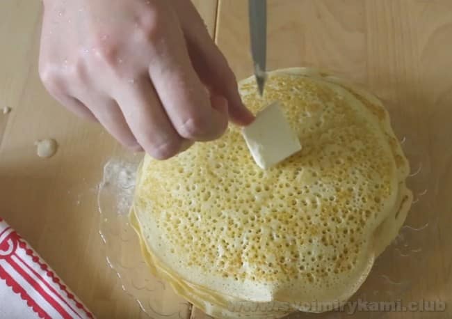 • Змастіть верхівку млинчика шматочком вершкового масла. Викладайте готові млинці один на одного і верхівку кожного змащуйте маслом.