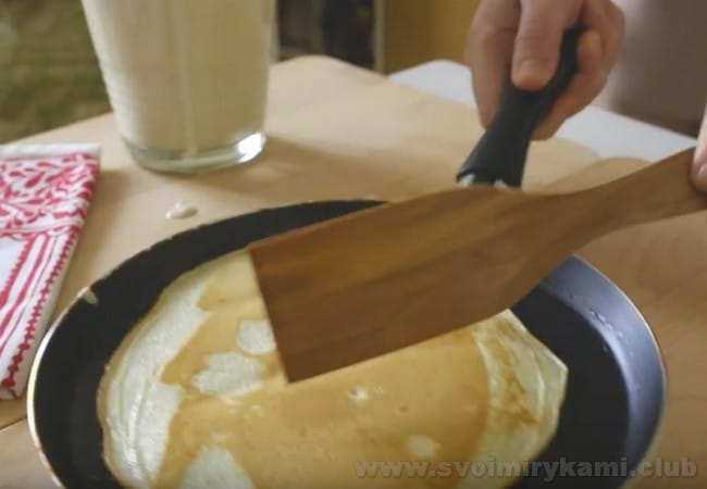 • Коли млинець трохи обсмажиться з одного боку, піддягніть краєчок млинця лопаткою і переверніть його на іншу сторону. Обсмажте млинець з іншого боку до легкого зарум’янювання і викладіть за допомогою лопаточки на блюдо для готових млинців.