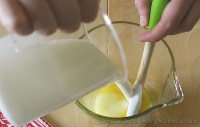• Туди ж влийте кефір, перемішайте.