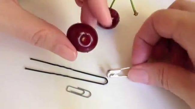 Промийте плоди і приберіть з них кісточки. Це можна зробити руками, розламавши вишню навпіл. А можна використовувати шпильку для волосся або шпильку, ними зручно піддягати кісточку, не пошкодивши зовнішній вигляд плоду.