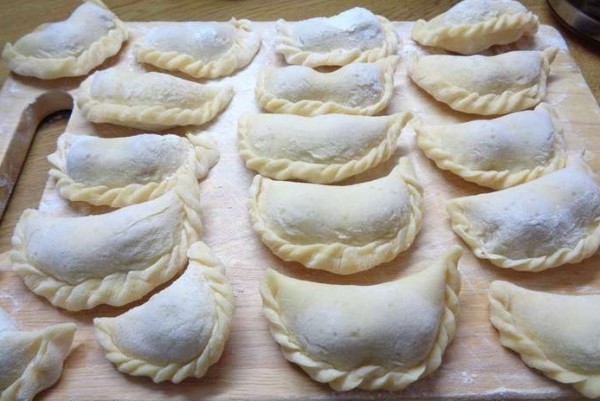 5. Складаємо кожен гурток з начинкою вдові і акуратно й ретельно защипуємо краю, щоб не залишалося дірочок, і начинка не випадала.