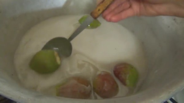Фрукти опускаються в сироп з цукру і води і доводять до кипіння на великому вогні, м’яко розмішуючи ложкою.