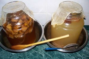 У суміш вливають цукровий сироп і масу змішують до однорідної консистенції. Посуд накривають марлею або папером і залишають на деякий час, поки заготовка не охолоне до кімнатної температури. Коли маса охолоне, її можна перекласти в тару зі скла і додати неочищений родзинки. Саме він почне бродити, коли ємність переставлять в темне тепле місце.