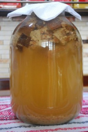 Після приготування основного компонента можна приступати до готування самого квасу. Для цього в трилітрову банку засипають 10-12 рум’яних сухариків середнього розміру і заливають їх цукровим сиропом. До них вливають воду таким чином, щоб у банку залишилася приблизно чверть вільного простору. Сюди буде додана приготовлена закваска.