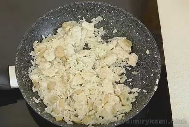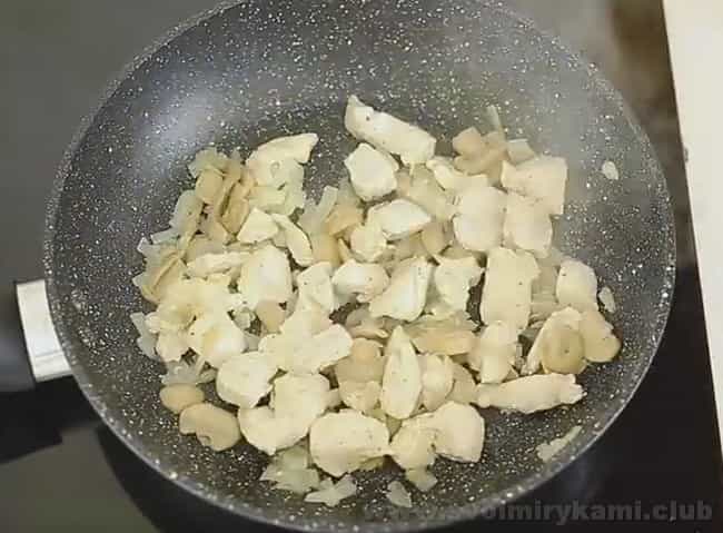 • Додаємо курку, а ще через 3 хвилини – гриби. Смажимо на середньому вогні, помішуючи начинку.