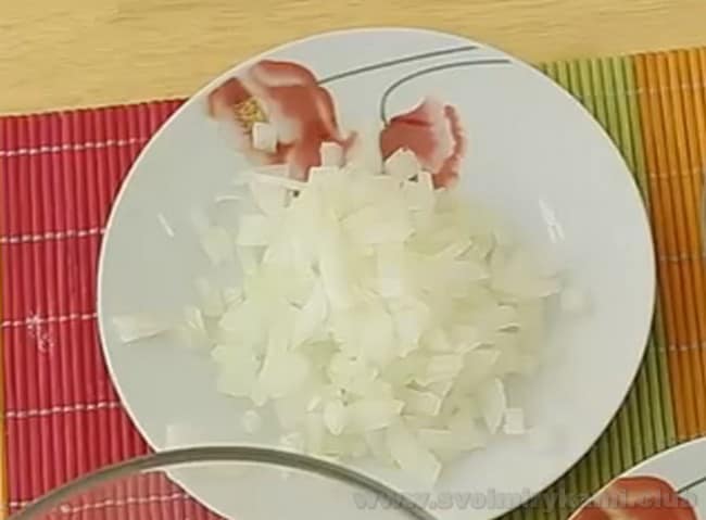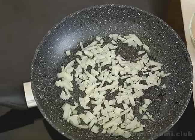 • На сковорідку налийте олію, дайте йому розігрітися. Викладаємо цибулю і смажимо всього 2 хвилини, він повинен тільки прихватиться.