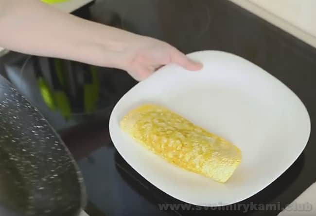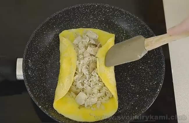 • Почекати 2 хвилини і викласти начинку на одну половинку або на серединку яєчного млинчика.