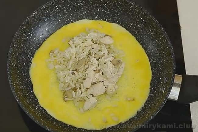 Головний інгредієнт начинки омлету по-японськи – рис. До нього можна додати те, що є в холодильнику. Підійдуть овочі, такі як консервований зелений горошок або кукурудза, а замість м’яса можна використовувати морепродукти, наприклад, очищені креветки. Додайте кілька ложок соєвого соусу в начинку, та ви отримаєте ще один чудовий відтінок смаку.