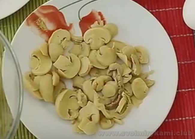 • Гриби очистити і нарізати. Можна використовувати готові консервовані гриби.
