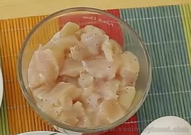 • Курячу грудку або філе помити, нарізати на невеликі шматочки.