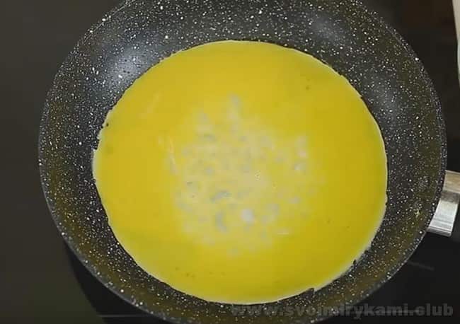 • Розігріту сковорідку змастити маслом і вилити яєчну масу.