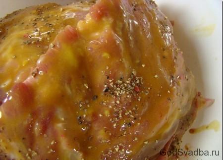 Тепер головна частина рецепта – створюємо маринад. Перемішайте в окремій чашці всі інгредієнти для нього. Гірчиця надає м’якість м’яса. Щодо меду не переживайте, його настільки мало, що солодкість майже не буде відчуватися. Зате, завдяки меду, на ребрах з’явиться апетитна золотава скоринка. Соєвий соус можна замінити сіллю, але рідина просолит м’ясо набагато краще. Ну і крім перцю можна додати свої улюблені приправи і трави. Ретельно обмазуємо масою кожен шматок м’яса як на фото. Далі потрібно чекати. Свинина маринується повільно, тому бажано залишити її в маринаді мінімум на годину. Чим більше, тим краще. Але якщо часу у вас зовсім немає, то збільшуйте кількість маринаду, щоб м’ясо стало смачним швидше.