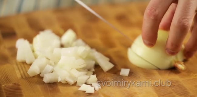 • Лук очищаємо, нарізаємо кубиками або тремо на тертці, потім переміщуємо масу на сковороду.