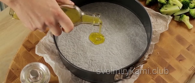 • Потім висипаємо в форму брокколі, ретельно розрівнюємо масу вручну.