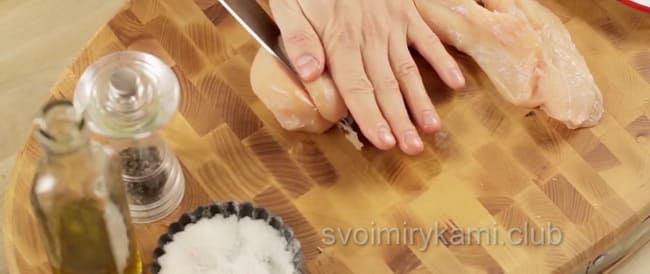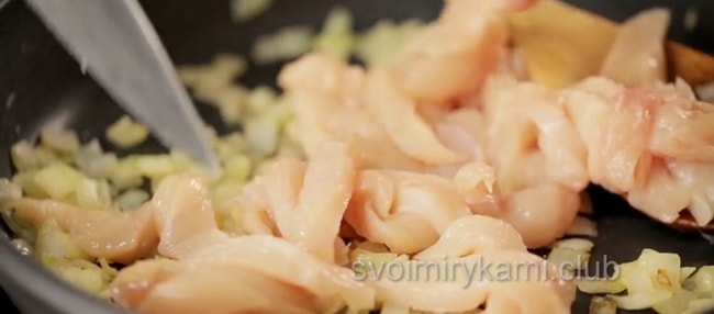 • Поки смажиться цибуля, куряче філе очистити від плівок і сухожиль.