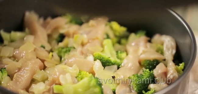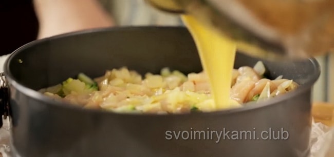 • Перемішуємо і заливаємо отриманою сумішшю масу з овочів і курки.