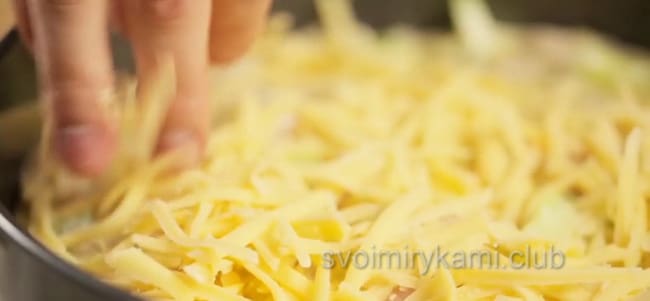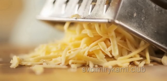 • Натираємо на крупній тертці сир, посипаємо їм заготовку для запіканки зверху.