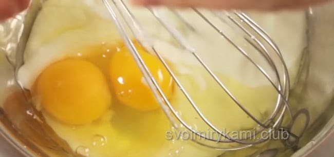 • В цей час готуємо заливку: яйця розбиваємо в глибоку миску. додаємо йогурт.