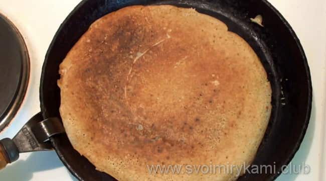 Випікаємо млинці до рум’яності з двох сторін, на першій стороні – близько хвилини, на другий – 20 секунд. Заварні млинці готові!