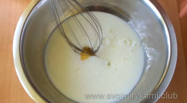 Вбийте в кефір яйце і розмішайте до однорідної консистенції, але поки не збивайте – для цього ще буде час.